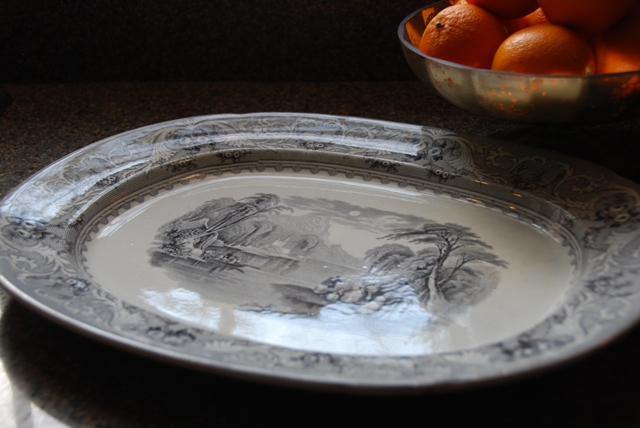 I just have to share one of my newest treasures, this Lake platter that I picked up in a junk shop in Devon for a few pounds. I rescued it from its grime-covered condition and made it my carry-on coming home on the airplane—I was too worried that it would get broken in my suitcase. Besides, my suitcase was filled with books! This dear old platter has already instated itself as an heirloom: I used it to serve both my Thanksgiving turkey and my Christmas ham!